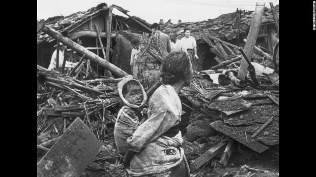 Previous Image Next Image Korean_War2 circa 1950: An elderly woman and her grandchild wander among the debris of their wrecked home in the aftermath of an air raid by U.S. planes over Pyongyang, the Communist capital of North Korea. (Photo by Keystone/Getty Images)
